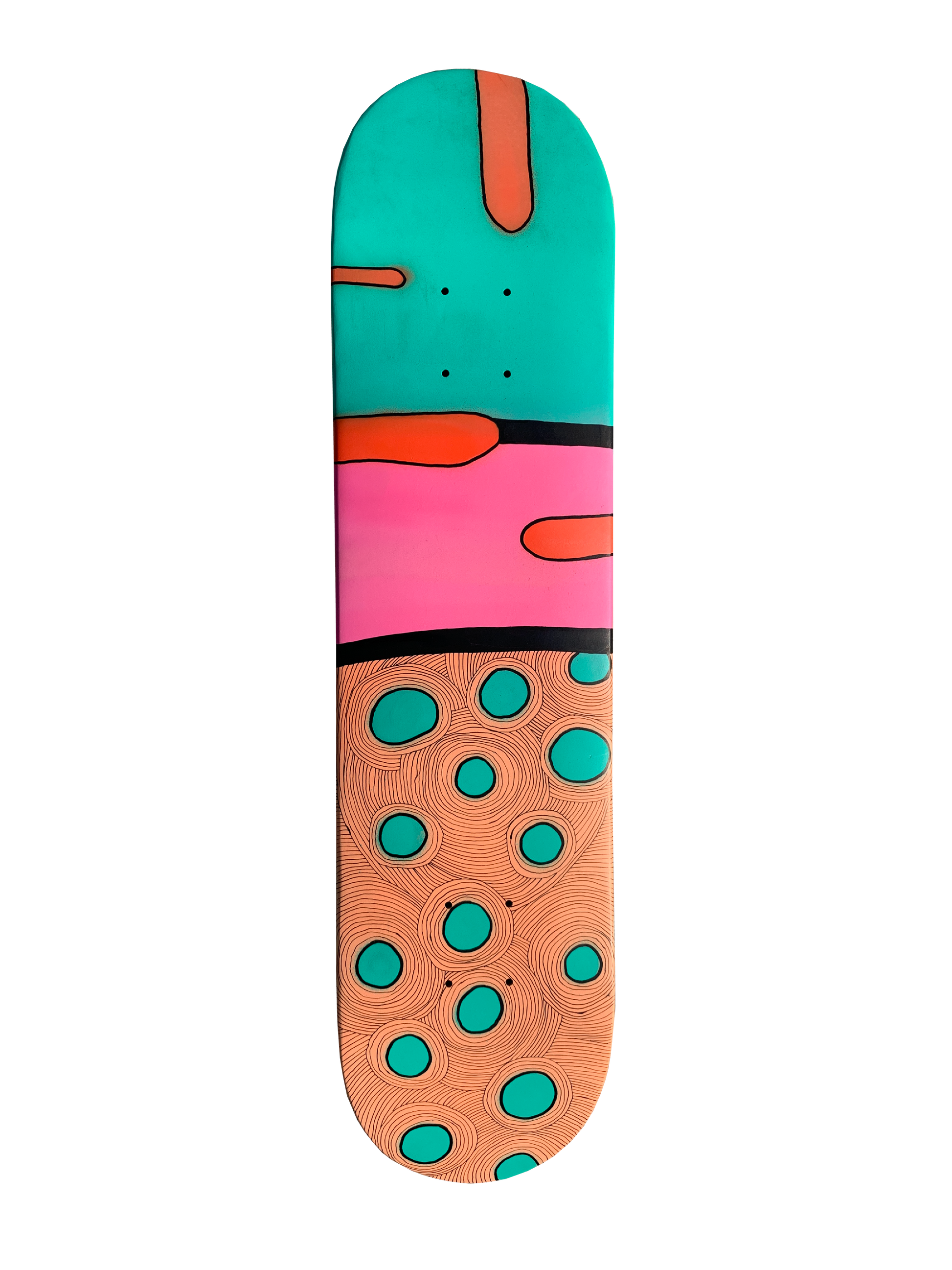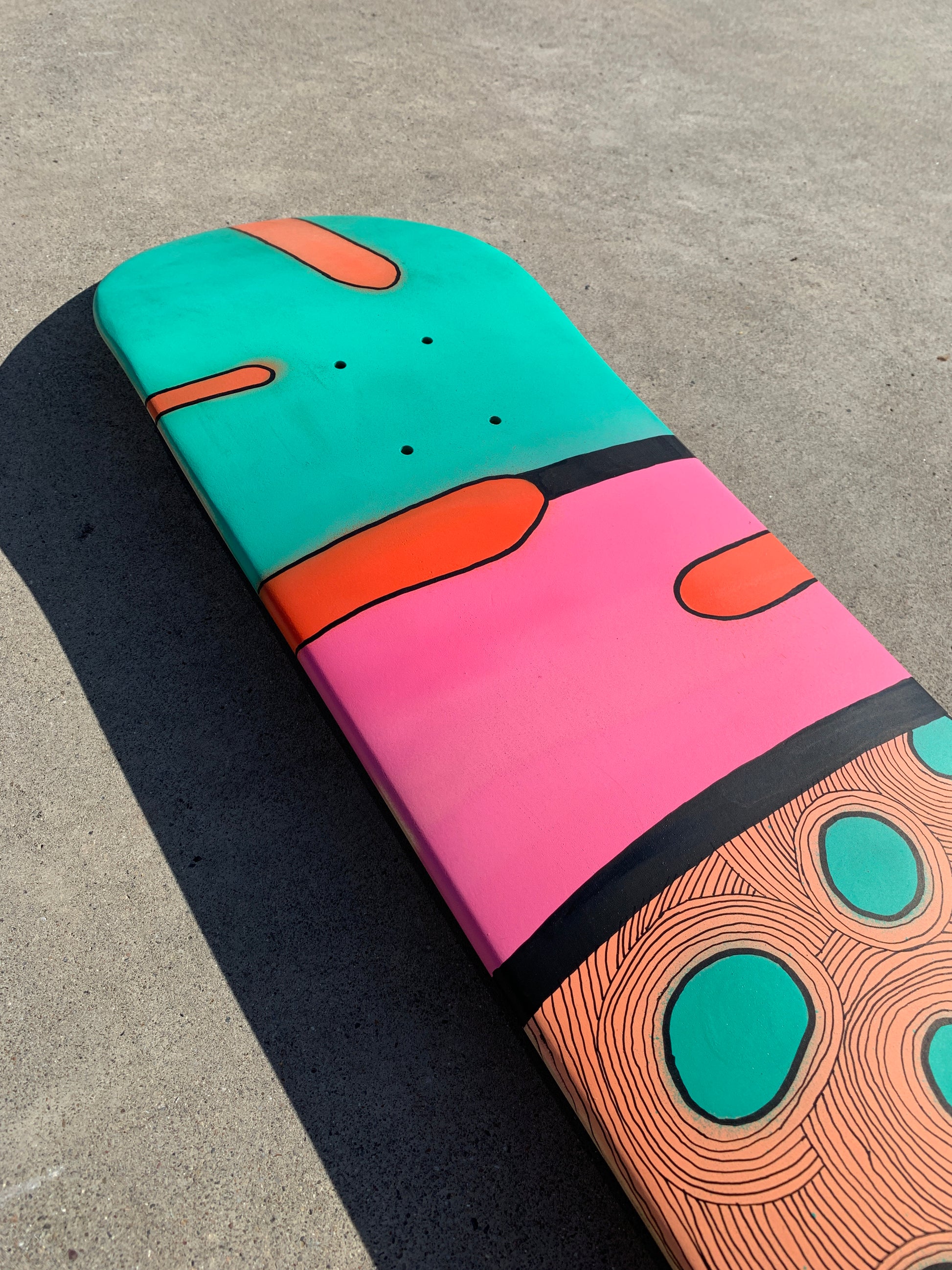 Acrylic spray paint + paint marker on skateboard deck